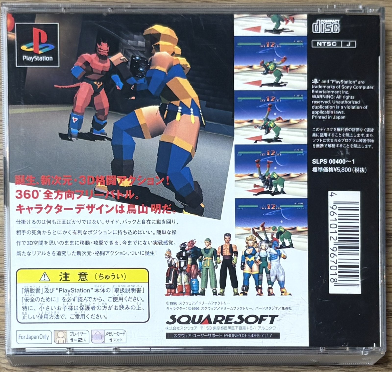 Tobal No. 1 (トバル NO. 1) is the first fighting game from SquareSoft. With character designs by Dragon Ball's Akira Toriyama. It's a great game by itself but it was always overshadowed by the game's main claim to fame, the Demo of Final Fantasy VII included with the game. No Japanese needed to play.