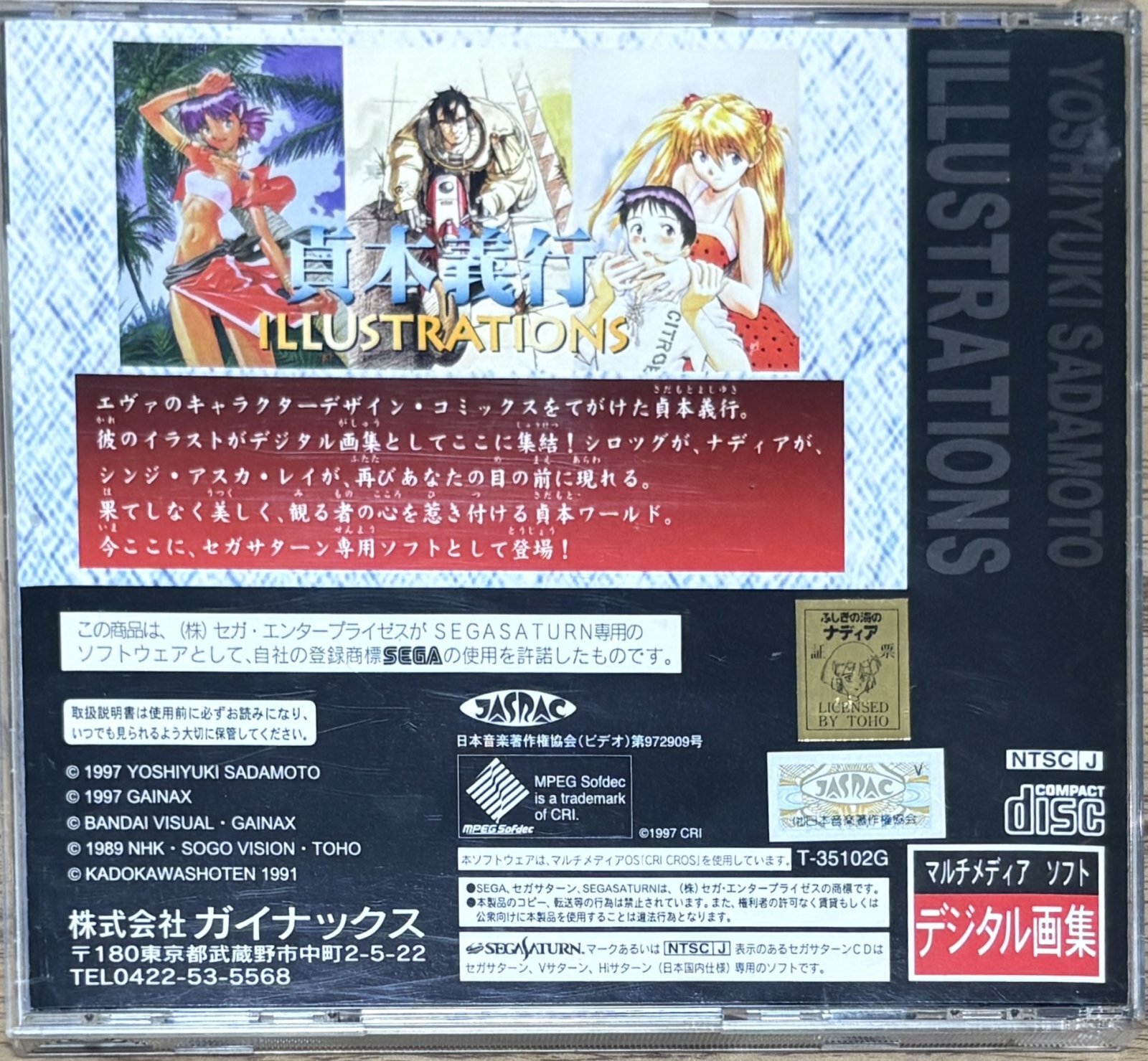 Yoshiyuki Sadamoto Illustrations (貞本義行イラストレーションズ) is a fan disc made by Gainax and celebrating the art of Yoshiyuki Sadamoto and the work he did for various Gainax productions such as Neon Genesis Evangelion, Nadia, etc. It's not required, but if you happen to have the MPEG movie card this disc will have enhanced video.