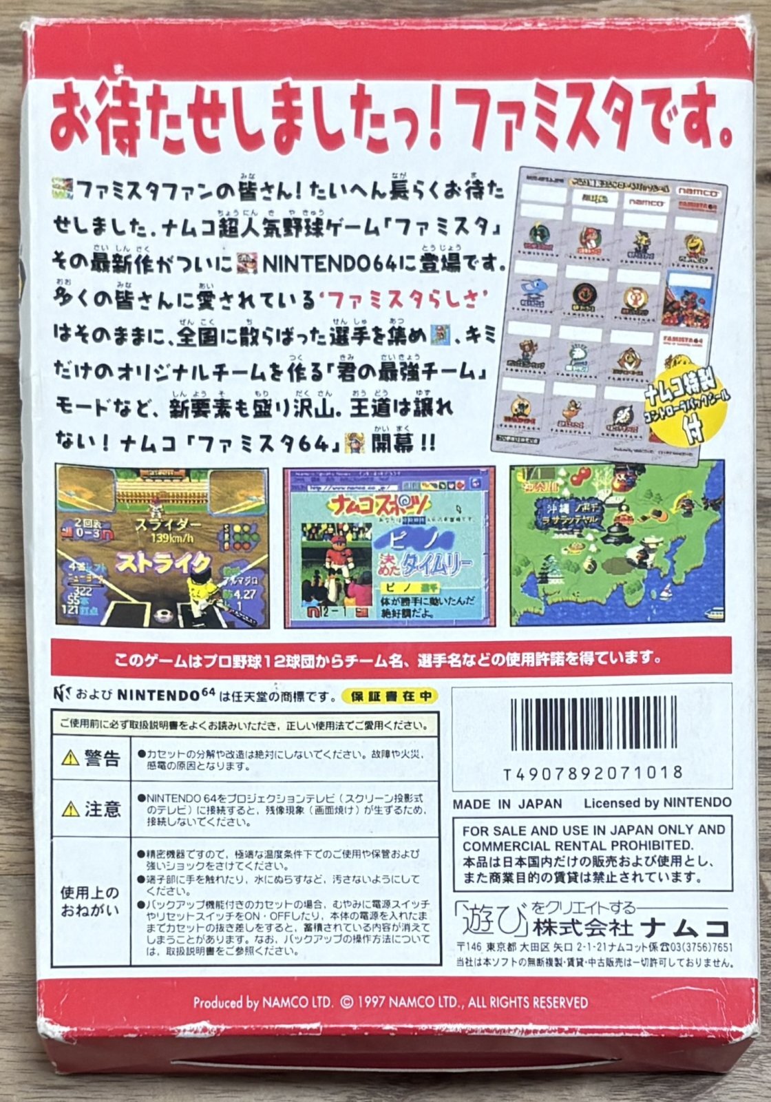 Famista 64 (ファミスタ64) is a good baseball game to begin with. A worthy successor to the legendary Famicom/Super Famicom series. But I really like the game for all the Namco cameos in the main game and it's mini games.