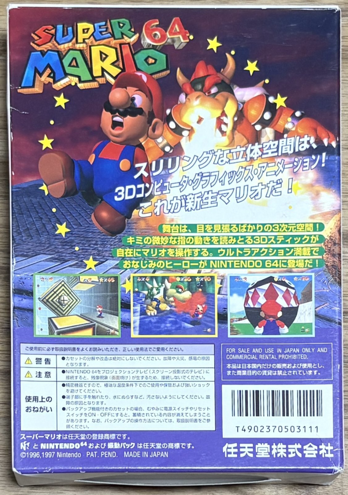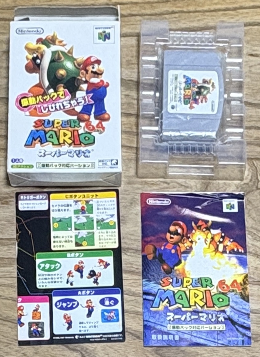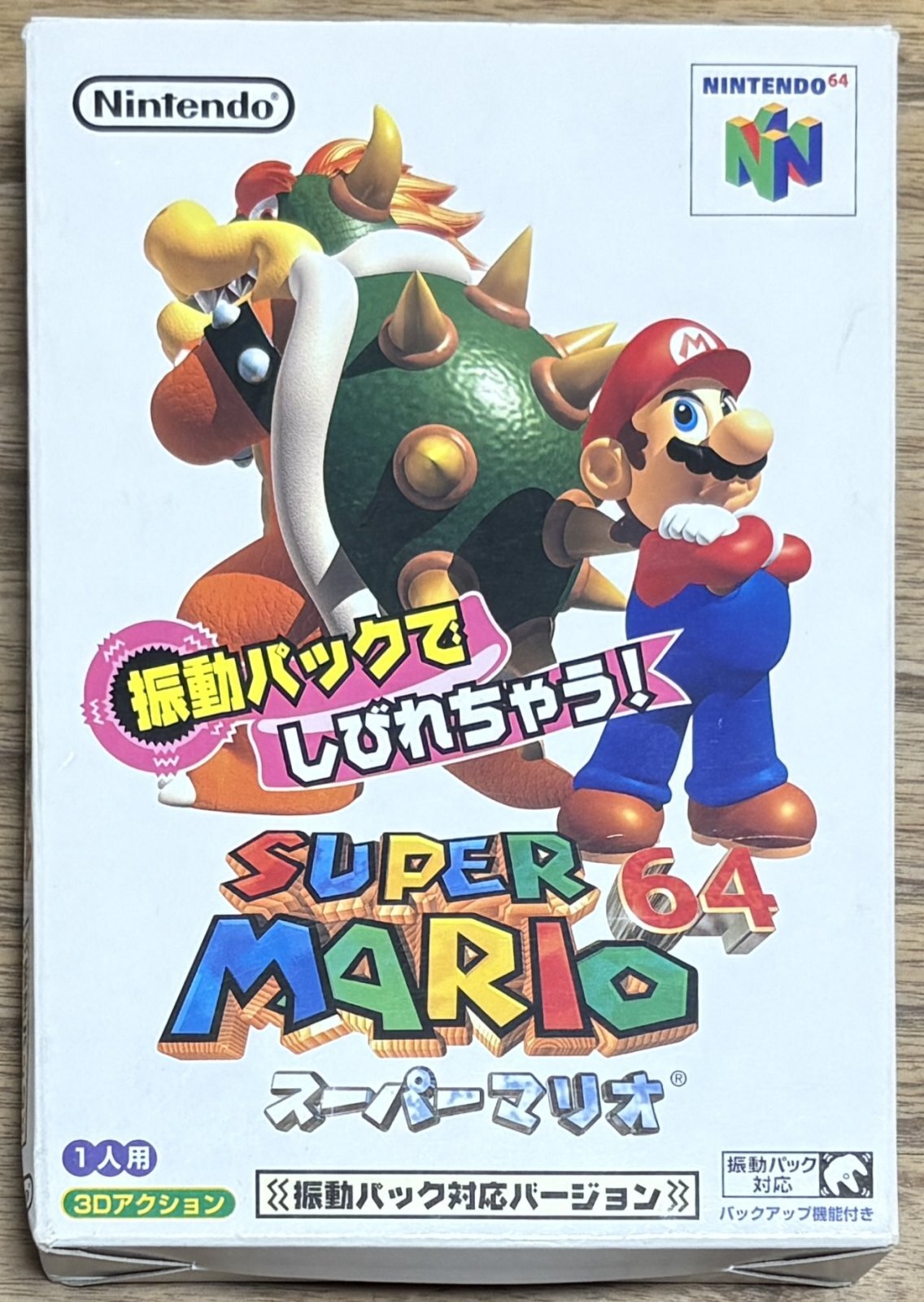 Super Mario 64 Shindō Pak Taiō Version (スーパーマリオ64 振動パック対応バージョン) if you have an N64 you probably already have this game. And if you don't, please get it. This is the killer app for the N64 and a literal game charger for the entire video game industry. This is the rarer 2nd release of this game adding Rumble Pack support and additional voice acting (from the US version). It is considered the version to get.