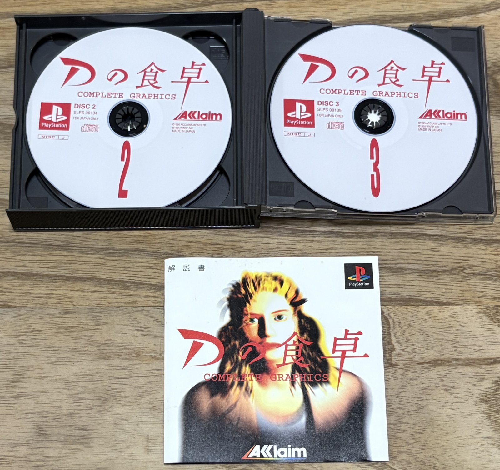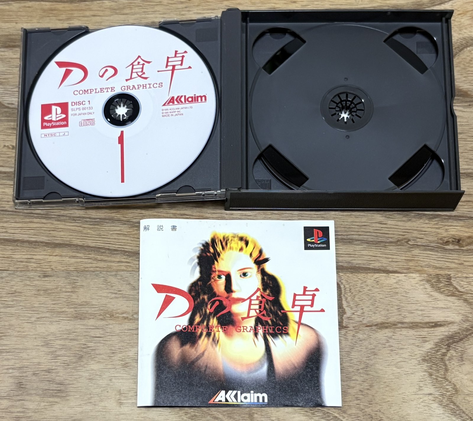 D no Shokutaku Complete Graphics (Dの食卓 COMPLETE GRAPHICS) is the PS1 port of D the twisted horror game / interactive movie. Violent, weird, terrifying, classic. Game is in Japanese but there is not much actual dialog. The graphics were updated to take advantage of the PS1 hardware, but it was released late and in very limited quantities due to Sony not printing enough to fill the original order this upset Kenji Eno so much he never released a game on a Sony platform again.