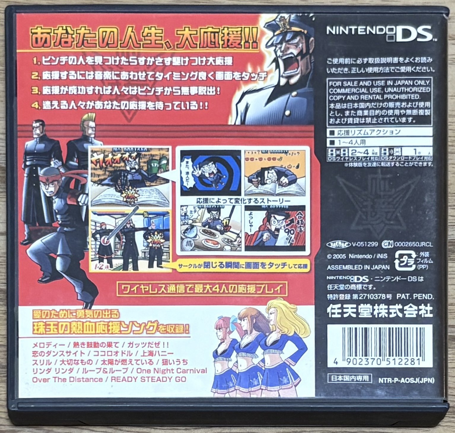 Osu! Tatakae! Ouendan (押忍!闘え!応援団) is easily one of my favorite DS games. It's so weird and wacky and wonderful. People are having problems and you play a squad if male cheerleaders who come to cheer them up. You do this through a super fun touch screen music game. And the music is really, really good too. You can play this game without knowledge of Japanese.
