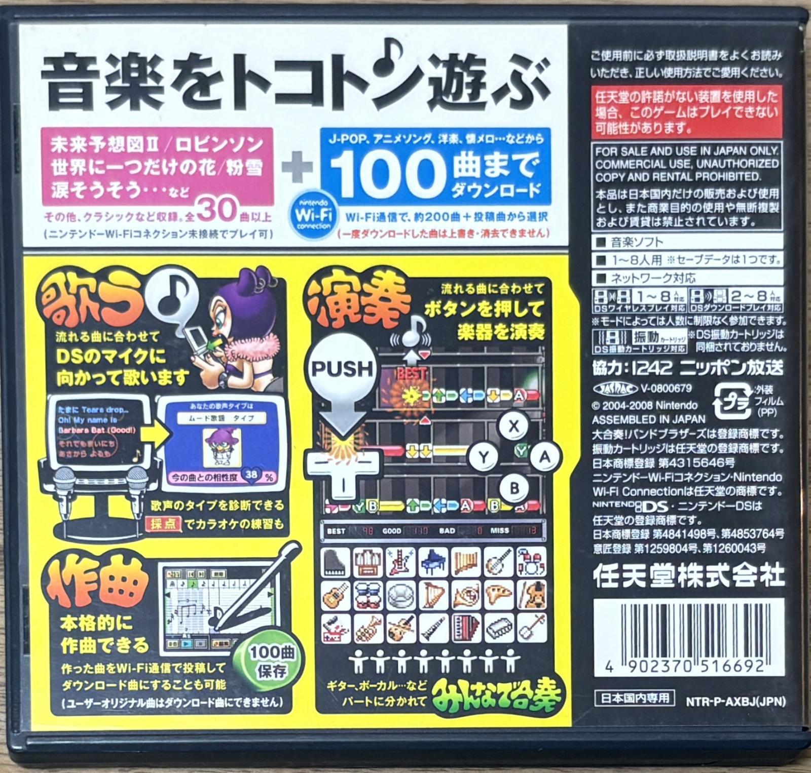 Daigasso! Band Brothers DX (大合奏!バンドブラザーズDX) is an expanded version of the Nintendo DS launch game Daigasso! Band Brothers. Like the first game it plays like a traditional music game but also allows song creation and interaction. This version has more songs and more modes. It's a really nice package. The menus are in Japanese but it's pretty easy to figure out and the game itself is very playable even to non-japanese speakers.