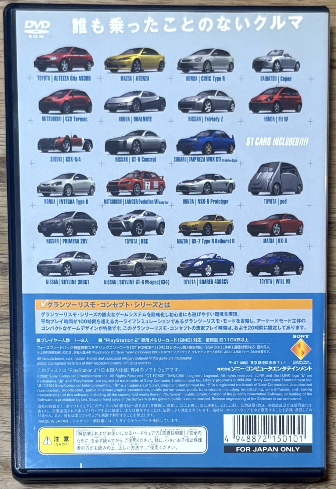 Gran Turismo Concept: 2001 Tokyo (グランツーリスモ コンセプト 2001 TOKYO) is one of the few Gran Turismo games not released in the US. Lots of cool concept cars (more than 50). Japanese ability not needed to play.