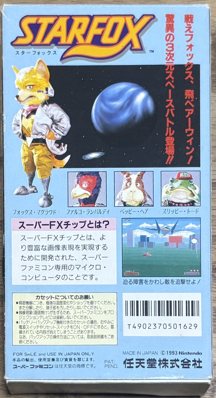 Star Fox (スターフォックス) is a classic rail shooter that amazed people at the time with it's Super FX enhanced polygonal graphics and great gameplay. No Japanese needed to play.