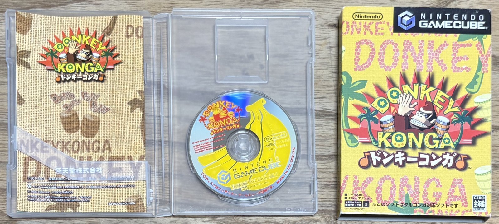 Donkey Konga (ドンキーコンガ) is a very fun music game similar to Namco's Taiko Drum Master, The Japanese version has a very different track listing with J-Pop and Anime songs. Requires Bongo Controllers (from any region) to play.