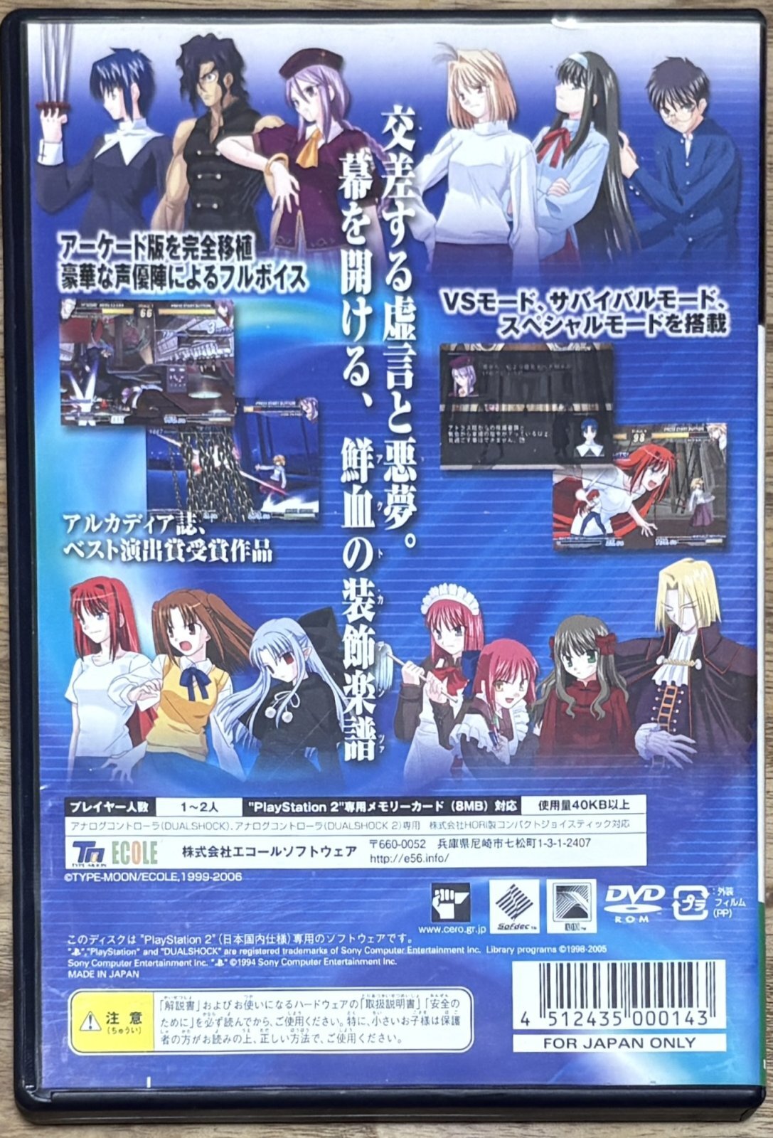 Melty Blood Act Cadenza (メルティブラッド アクトカデンツァ) is a 2D fighting game with characters from visual novels by Type-Moon. When I first played it I didn't know about the original games and I still enjoyed it. Now that I have played some Type-Moon games, I like it even more. No Japanese skill needed to play.