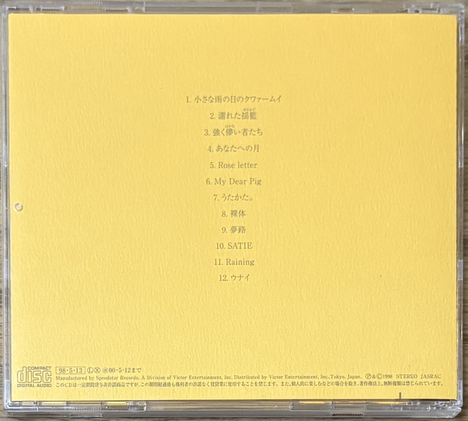Vinnk's Take: This is my favorite Cocco album. I listened to this one more than any of the others. Maybe because when I got it in 2001 I did not speak much Japanese and several song on this album like "My Dear Pig", "Rose letter" "Satie" and more. But now that I am older I am really appreciating the Japanese tracks like "Raining". What was cool at the time and is still cool now is that the booklet with the CD has all the lyrics in both Japanese and English. So even if you don'r know Japanese, you can appreciate the words and meaning of the songs. Highly recommended.