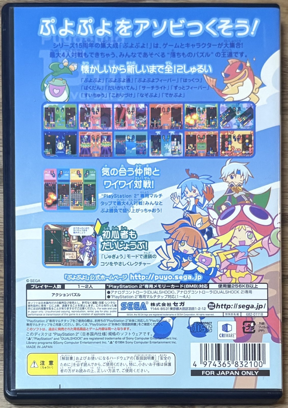 Puyo Puyo 15th Anniversary (ぷよぷよ! 15th Anniversary) is a special anniversary edition of the classic falling blobs puzzle game Puyo Puyo. Redrawn graphics and a 4 player mode was added. Tons of fun. No Japanese needed to play.