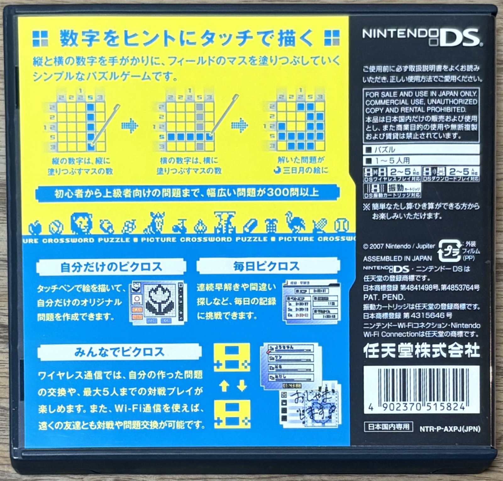 Picross DS (ピクロスDS) is the first touch screen entry in the Nintendo Picross series. Lots of great puzzles. Great interface. No Japanese needed so long as you know the rules of Picross. And if you haven't played picross before this game is a great starting point. It may look boring or complicated but once you get into it it's both addictive and intensely satisfying. This is probably one of my most played games on the DS.