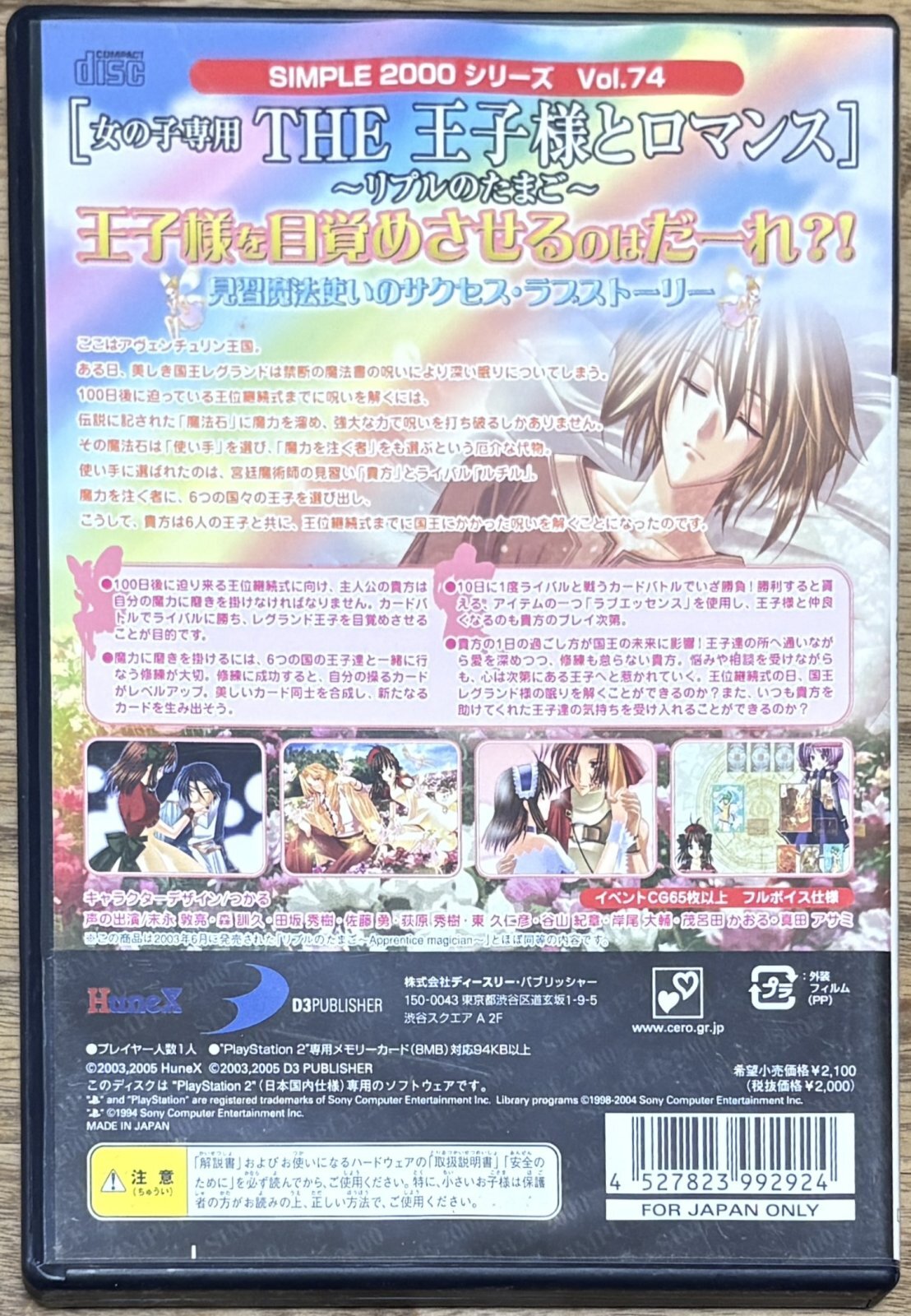 Onna no Ko Senyou THE Ōjisama to Romansu ~Ripuru no Tamago~ SIMPLE 2000 Vol.74 (SIMPLE2000シリーズ Vol.74「女の子専用 THE 王子様とロマンス 〜リプルのたまご〜) is a romance adventure game. The (女の子専用) on the box translates to "for girls only", but YOU CAN'T TELL ME WHAT TO DO!