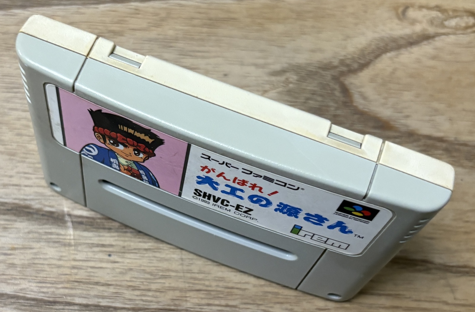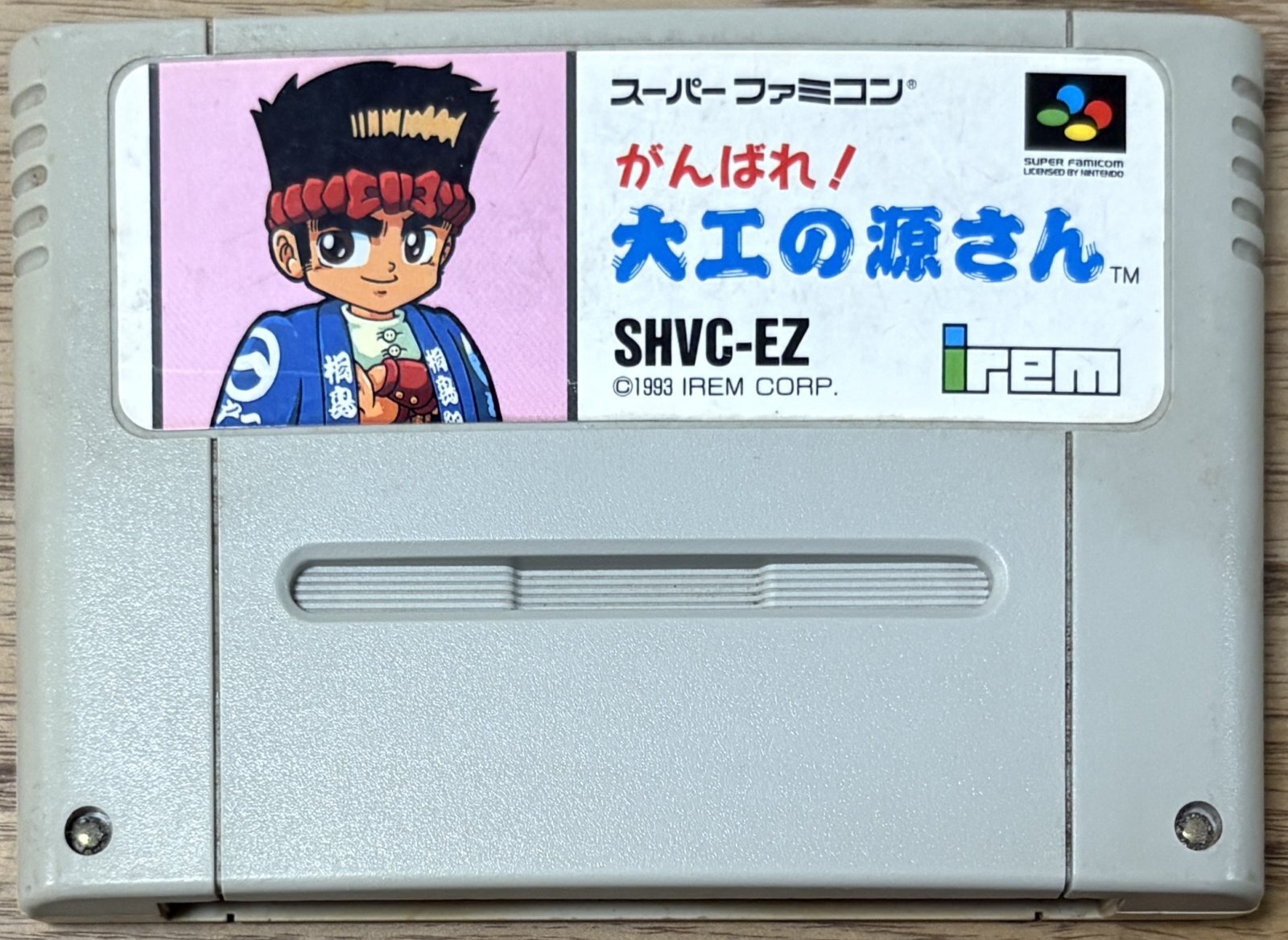 Ganbare! Daiku no Gen-san (がんばれ!大工の源さん). Is a fun Irem platformer where you play a carpenter with upgradable hammers. This series is known outside of Japan as Hammerin’ Harry. No Japanese needed to play.