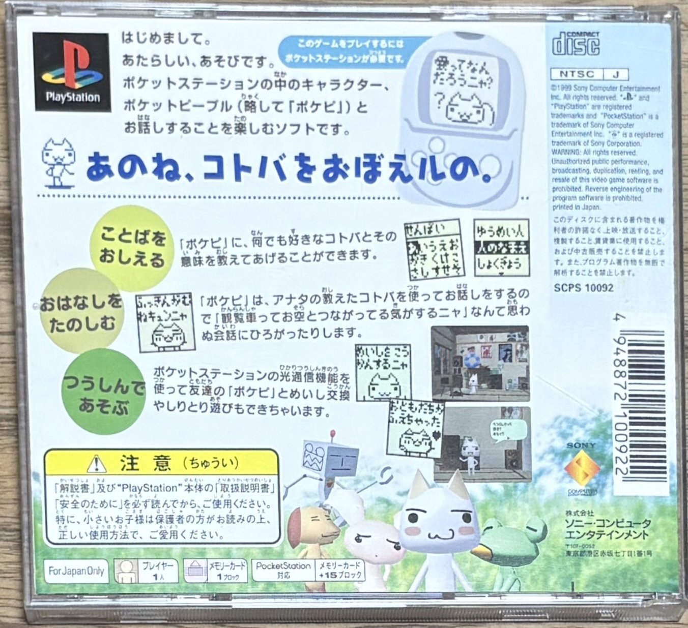 Doko Demo Issyo (どこでもいっしょ) is the first game to star Toro Inoue (also known as the Sony Cat) would would go on to be the Playstation mascot character in Japan. This game is compatible with the PocketStation.